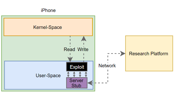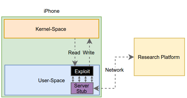 To allow for increased flexibility, we’ll aim to design our research platform to be modular; instead of tying the platform to a specific memory access mechanism, we’ll use Ian’s exploit as a “black-box”, only deferring memory accesses to the exploit’s primitives.