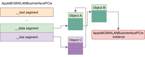 Looking at the code above, it appears that the PCIe object is not allocated from a special pool. Perhaps, instead, the object is addressable through data stored in the driver’s BSS or data segments? If so, then by following every “chain” of pointers originating in the above segments, we should be able to locate a chain terminating at our desired object.