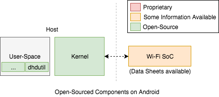 Furthermore, Android utilises the Linux Kernel, which is licensed under GPLv2. Therefore, the kernel’s source code, including that of the device drivers, is freely available. Reading through Broadcom’s device driver (bcmdhd) turned out to be an invaluable resource -- sparing us some unnecessary reverse-engineering while also allowing us to easily assess the ways in which the chip and host interact with one another.