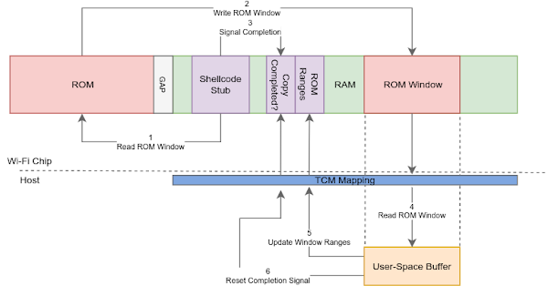 The TCM mapping provides a view into the Wi-Fi chip’s RAM. While accessing the RAM is undoubtedly useful (as it allows us to gain visibility into the runtime structures used by the chip, such as the heap’s state), it does not allow us to directly access the chip’s ROM. So why did we go to all of this effort to begin with? Well, while thus far we have only used the mapped TCM buffer to read the Wi-Fi SoC’s RAM, recall that the same mapping also allows us to freely write to it -- any data written to the memory-mapped buffer is automatically reflected back to the Wi-Fi SoC’s RAM.