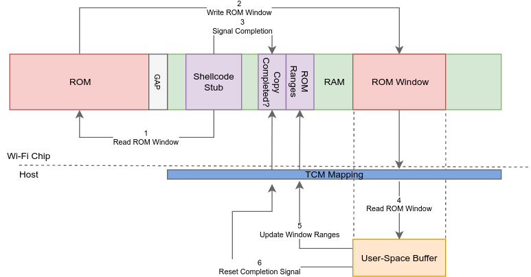 Building on this technique, let’s insert a hook into a commonly invoked RAM function (such the the chip’s “ioctl” handler). Once invoked, our hook will simply copy small “windows” of the ROM into predetermined regions in RAM. Note that since the RAM is only slightly larger than the ROM, we cannot leak the entire ROM in one go, so we’ll have to resort to this iterative approach instead. Once a ROM chunk is copied, our shellcode stub signals completion, cause the host to subsequently extract the leaked ROM contents and notify the stub that the next chunk of ROM may be leaked.