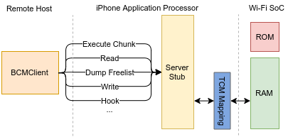 Having extracted the ROM and achieved TCM access capabilities, we can also build a module to allow us to easily interact with the Wi-Fi chip. This module will act as a debugger of sorts for the Wi-Fi firmware, allowing us to gain full read/write capabilities to the Wi-Fi firmware, as well as providing several key debugging features.