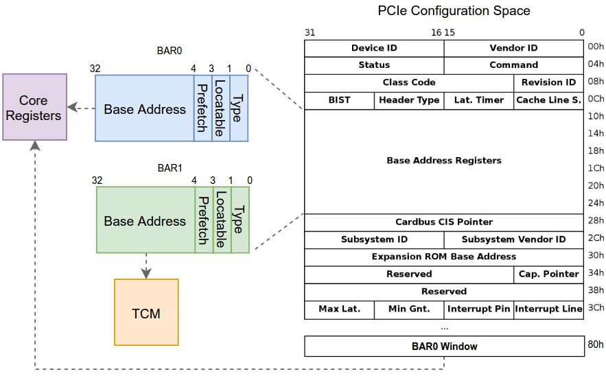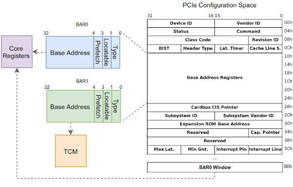 BAR0 is used to map-in registers corresponding to the different cores on the Wi-Fi SoC, including the ARM processor running the firmware’s logic, and more esoteric components such as the PCIe Gen 2 core on the Wi-Fi SoC. The cores themselves can be selected by accessing the PCIe configuration space once again, and programming the “BAR0 Window” register, directing it at the backplane address corresponding to the requested core.