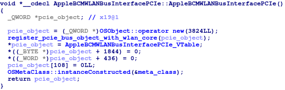 Cross-referencing our way up the call-chain, it appears that all of the above functions are methods pertaining to instances of a single class, which incidentally bears the same name as that of the driver: AppleBCMWLANBusInterfacePCIe. Since several functions in the call-chain are virtual functions, we can locate the class’s VTable by searching for 64-bit words containing their addresses within the kernelcache.