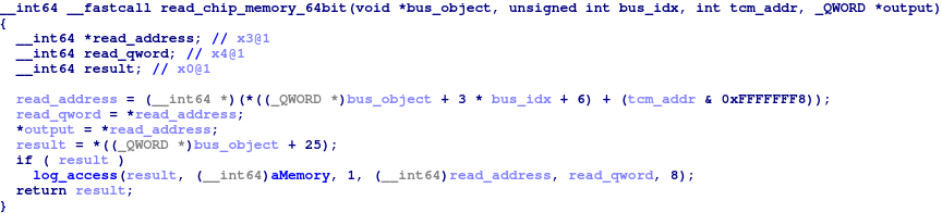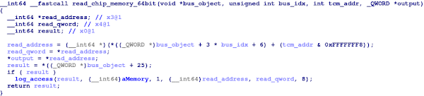 After reverse-engineering much of the driver, we come across a group of suspicious-looking functions that appear like candidates for TCM accessors. All the above functions serve the same purpose -- accessing a memory-mapped buffer, differing from one another only in the size of the word used (16, 32, or 64-bit). Anecdotally, the corresponding APIs for TCM access in the Android driver follow the same structure. What’s more, the above functions all reference the string “Memory”... We might be onto something!