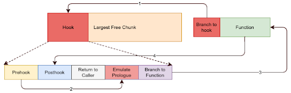 Doing so allows us to provide a convenient interface through which we simply select a target RAM function and provide a corresponding assembly stub, and the framework then proceeds to patch the function on our behalf, direct it into our shellcode to execute our hook (and emulate the original prologue), and finally return back to the original function. The shellcode stub itself is written into the top of the heap’s largest free chunk, allowing us to avoid overwriting any important data structures in the RAM.
