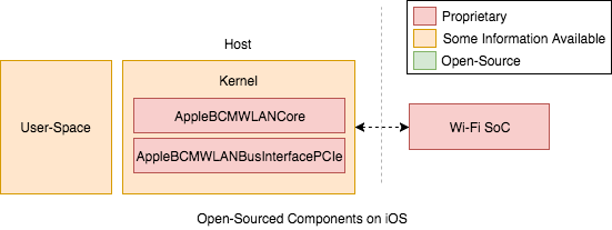 Additionally, unlike the Android ecosystem, Apple has chosen to develop their entire host-side stack “from scratch”. Most importantly, the iOS drivers used to interact with Broadcom’s chip are written by Apple, and are not based on Broadcom’s FullMAC drivers (bcmdhd or brcmfmac). Other host-side utilities, such as Broadcom’s debugging toolchain, are thus also not included.