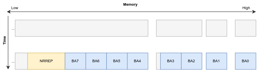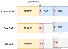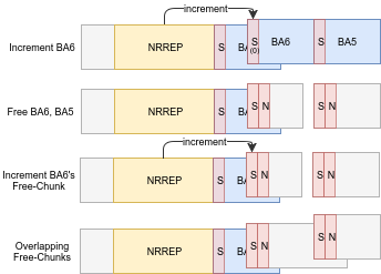 Next, we’ll increase BA6’s size slightly until it nearly overlaps with BA5. Then, we can free both BAs, and proceed to use the NRREP buffer to increase BA6’s free chunk until it overlaps with BA5’s. It’s important to note that since both “holes” are much smaller than the NRREP buffer, it won’t be placed within them, leaving us to utilise them as we please.