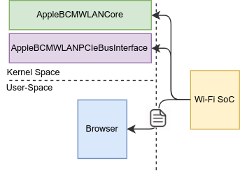 In addition to the aforementioned attack surface, the Wi-Fi firmware itself can carry out attacks against the host. As we’ve seen in previous blog posts, the chip communicates with the host using a variety of control messages and through a privileged physical interface (e.g., PCIe); if we were to find errors in the host’s processing of any of those, we might be able to take over the host itself (indeed, we’ll carry out such attacks in the next blog post!).