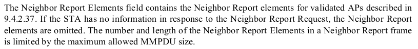 Neighbor Report Response (NRREP) frames are reports delivered from the access point to stations in the network, informing stations of neighbouring access points in their vicinity. Upon roaming, the stations may use these parameters to reassociate with the aforementioned neighbours. Providing this information spares the stations the need to perform extensive scans on their own -- a rather time consuming operation. Instead, they may simply rely on the report, informing it of the specific channels and operating classes inhabited by each neighbour.