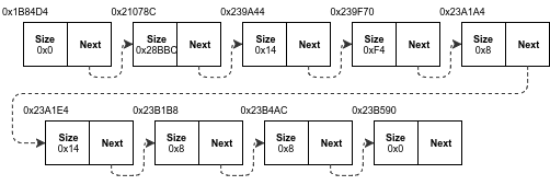As we can see, several small chunks are strewn across the heap, alongside a single large chunk. From the structure above, we can deduce that in order to create a predictable allocation pattern for our NRREP buffer, we’d simply need a shaping primitive allowing us to fill all the “holes” whose sizes match that of the NRREP buffer.