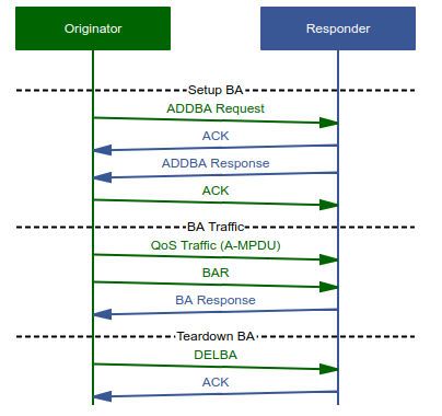To utilise BAs, a corresponding session must first be constructed. This is done by transmitting an ADDBA Request (IEEE 802.11-2016, 9.6.5.2) from the originating peer to the responder, resulting in an ADDBA Response (9.6.5.3) being sent in the opposite direction, acknowledging a successful setup. Similarly, BAs can be torn down by sending a DELBA frame, indicating the BA should no longer be active. Each BA is identified by a unique Traffic Identifier (TID). While the standard specifies up to 16 supported TIDs, the firmware only supports the first 8, restricting the number of BAs possible in firmware to the same limit.