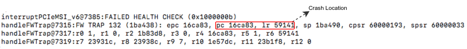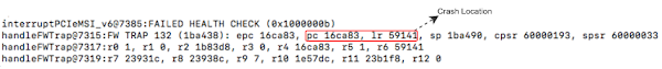 To get down to the bottom of this odd behaviour, we’ll need to locate the source of the crash. Inspecting the AppleBCMWLANBusInterfacePCIe driver, it appears that whenever a trap is generated by the firmware, the driver simply collects the aforementioned crash data, and outputs it to the device’s syslog. Therefore, to inspect the crash report, we’ll simply dump the syslog using idevicesyslog. After generating a crash we are presenting with the following output: