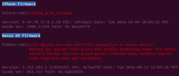 In the context of Android-resident firmware images, identifying the supported features was made easier due to the inclusion of “feature tags” within the version string embedded in the firmware’s RAM image. Each tag indicated support for a corresponding feature within the firmware image. Unfortunately, the iPhone’s Wi-Fi firmware images made away with the detailed version strings, and instead opted for a generic string containing the build type and the chip’s revision:
