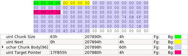 Nonetheless, it is not entirely impossible that such objects exists. For example, any in-use allocation starting with a 32-bit zero word would be a valid free chunk. Similarly, chunks could begin with 32-bit pointers to other data types, which themselves may constitute a valid chain of free chunks. Even better yet, any data structure in the firmware’s RAM (not only heap chunks) could conceivably masquerade as a free chunk, so long as it follows the above format.