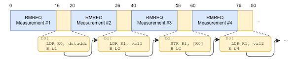 To get around this limitation, we’ll use one more action frame: Radio Measurement Requests (RMREQ). These frames are part of the 802.11k RRM standard, and allow for periodic measurements to be performed (and reported) by the firmware. Similarly to SPECMEAS frames, their handler allocates several bytes of data for each measurement IE encoded in the request.