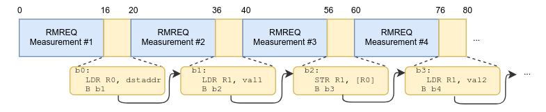 Lastly, we need to consider the problem of the shellcode’s internal structure. Unlike SPECMEAS frames which allowed us to control multiple bytes in each chunk of the allocated buffer, RMREQ frames only provide control over four subsequent bytes out of every 20-bytes allocated. Luckily, as Thumb is a dense instruction set, it allows us to cram two instruction into each 32-bit controlled word. Therefore, we can break up our shellcode using the following pattern: the first 16-bit word will encode an instruction of our choosing, whereas the second word will contain a relative branch to the next controlled chunk. Formatting our shellcode in this manner allows us to construct arbitrarily large chunks of shellcode:
