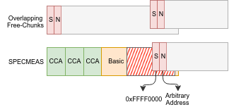 While the list’s contents lays within one of the disallowed zones, recall that this validation is only performed by the “free” function, whereas “malloc” will happily carve allocations at any address, without consulting the above list. Therefore, by pointing our free chunk to a location overlapping the “disallowed ranges” list, we can use a SPECMEAS frame to overwrite its contents (thereby nullifying its effect). While SPECMEAS frames are immediately freed after they are allocated, this is no longer a concern, as by the time the “free” occurs, the “disallowed ranges” will have already been overwritten!