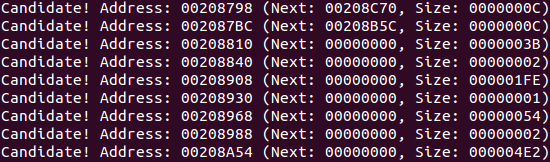 To get to the bottom of this, we’ve written a short script that goes over the firmware’s contents, searching for blocks that match the aforementioned description. Each block we discover constitutes a potential overwrite target by directing our fake free chunk at it. Running the script on a RAM dump of the firmware, we are greeted with the following result: