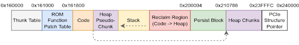 Using the steps above, we can disable the “disallowed ranges” list, allowing us to subsequently use the commandeered free chunk in order to hijack one of the function pointers in the persist block. Finally, we simply require a means of stashing some shellcode in a predictable location within the firmware’s RAM. By doing so, we will be able to direct the aforementioned function pointer at our shellcode, leading to arbitrary code execution.