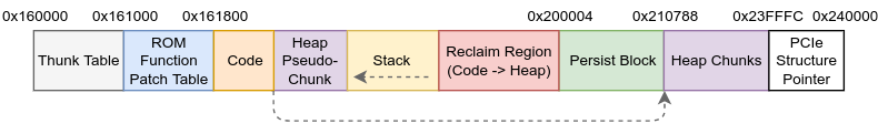 The same cannot be said of the RAM image; while some similarities exist between the current image and the previously analysed ones, their internal layouts are substantially different. Whereas Android-resident firmwares contained interspersed heap chunks between code and data blobs, this quirk is no longer present in the current RAM image. Instead, the heap chunks are mostly placed in a linear fashion. One exception to this rule is the initialisation code present in the RAM -- once the firmware’s bootup process completes, this blob is reclaimed, and is thereafter converted into an additional heap chunk.