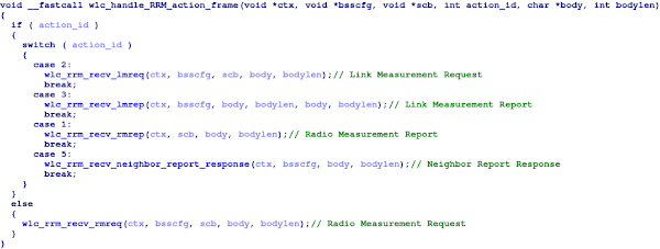 To illustrate the amount of complexity encapsulated by action frames, let’s return to the iPhone’s Wi-Fi firmware. Tracing our way through the RX-path, we quickly reach the function at which action frames are handled within the firmware (referred to as “wlc_recv_mgmtact” in the ROM):
