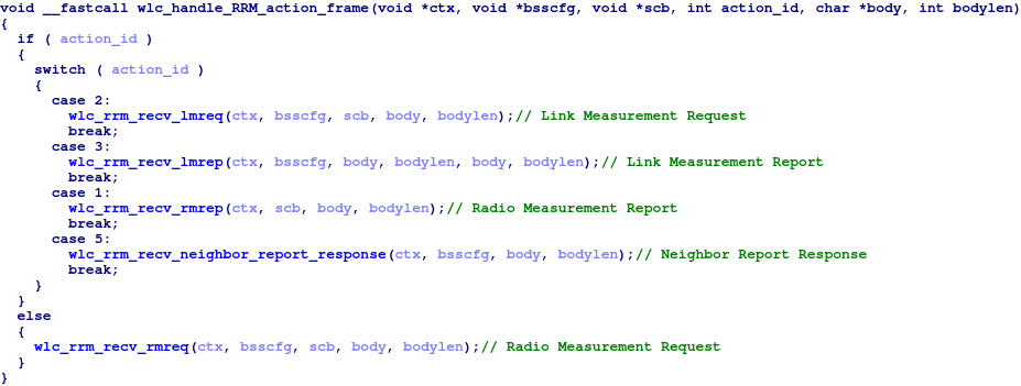 1. int wlc_rrm_recv_nrrep(void* ctx, ..., uint8_t* body, uint32_t bodylen) {