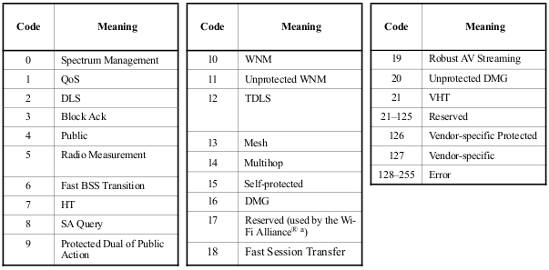Continuing to read through the standard, we can piece together the frame’s overall structure; starting from the action frame header, all the way the encapsulated IE: