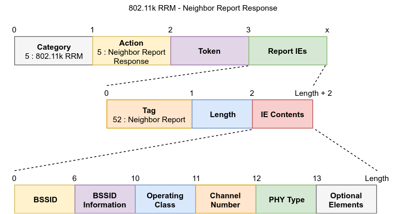 As we can see above, the bulk of the data in the NRREP frame is conveyed through the “Neighbour Report” IE. NRREPs may contain one or more such IEs, each indicating the presence of a single neighbour.