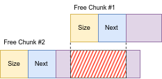 Instead of first increasing a heap block’s size, then freeing it to create overlapping chunks, let’s opt for different approach. We’ll arrange for the following layout; first, we’ll create two free chunks, which are not immediately adjacent to one another (to prevent the allocator from coalescing them). Then we’ll use the NRREP primitive to slowly increment the size of one block, until it overlaps the other.