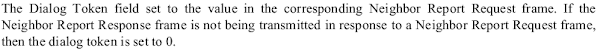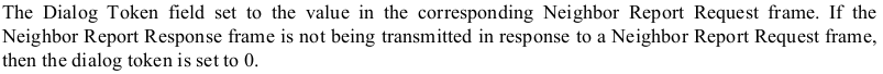 Like many action frames, NRREPs also contain a “dialog token” (9.6.7.7). This 1-byte field is used to correlate between requests issued by a client, and their corresponding responses. As their name implies, Neighbour Report Responses are typically transmitted in response to a corresponding request made by the client earlier on (commonly as a result of a radio measurement indicating that a roam may be imminent). As we’d expect, upon sending a Neighbor Report Request, the client generates and embeds a dialog token, which in later verified by it when processing the corresponding NRREP returned by the access point.