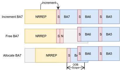 We’ll do so by leveraging a little trick. After allocating all the BAs, we’ll proceed to slightly increment the last BA’s size using the vulnerability primitive. Once that chunk is freed, a free chunk is subsequently created in its place, spanning the new expanded size instead of the original allocation’s size. Since the new free chunk extends into neighbouring BAs, the next BA allocation will therefore overlap a previously allocated BA. This allows us to effectively “sink” an allocation into neighbouring blocks, advancing the scope of influence of our NRREP buffer to previously unreachable objects!