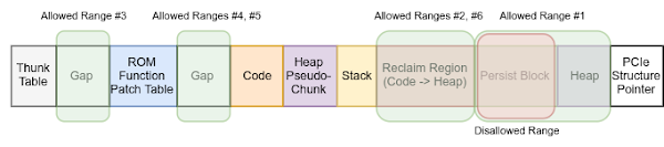 Each attempt to allocate data on top of the aforementioned block of function pointers using SPECMEAS frames, immediately causes the firmware to halt. Inspecting the source of the crash leads us back to one of the mitigations we mentioned earlier on; the “disallowed ranges” list.