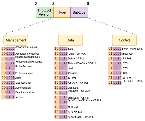 Wi-Fi frames can be split into three distinct categories. Each frame is assigned a category by inspecting the “type” and “subtype” fields in its MAC header: