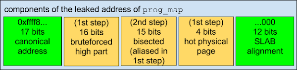 When this attack finds a hit—a cached memory location—the upper 33 bits of the kernel address are known (because they can be derived from the address guess at which the hit occurred), and the low 16 bits of the address are also known (from the offset inside user_mapping_area at which the hit was found). The remaining part of the address of user_mapping_area is the middle.