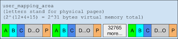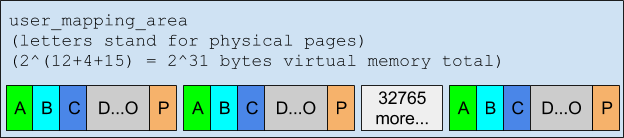 Because such straightforward brute-force guessing of the address would be slow, the following optimization is used: 215 adjacent userspace memory mappings [9], each consisting of 24 pages, are created at the userspace address user_mapping_area, covering a total area of 231 bytes. Each mapping maps the same physical pages, and all mappings are present in the pagetables.