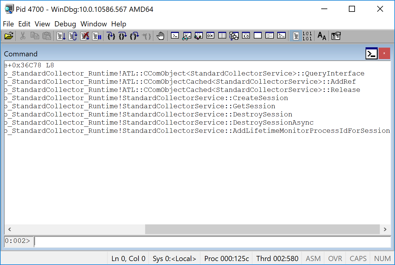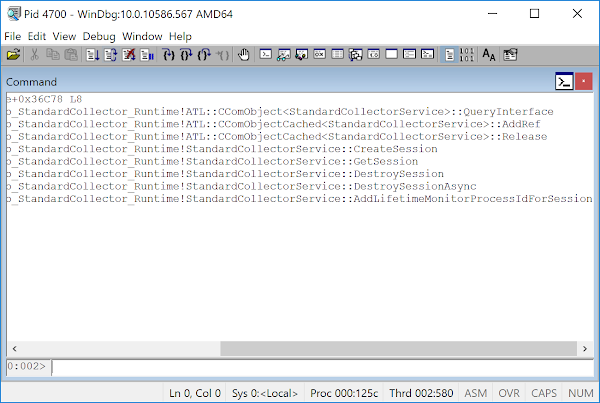 The two most useful pieces of information here are the Interface pointer, which is the location of the heap allocated object (in case you want to inspect its state), and the VTable pointer for the interface. The VTable address gives us information for where exactly the COM server implementation is located. As we can see here the VTable is located in a different module (DiagnosticsHub.StandardCollector.Runtime) from the main executable (DiagnosticsHub.StandardCollector.Server). We can verify the VTable address is correct by attaching to the service process using WinDBG and dumping the symbols at the VTable address. We also know from before we’re expecting 8 methods so we can take that into account by using the command: