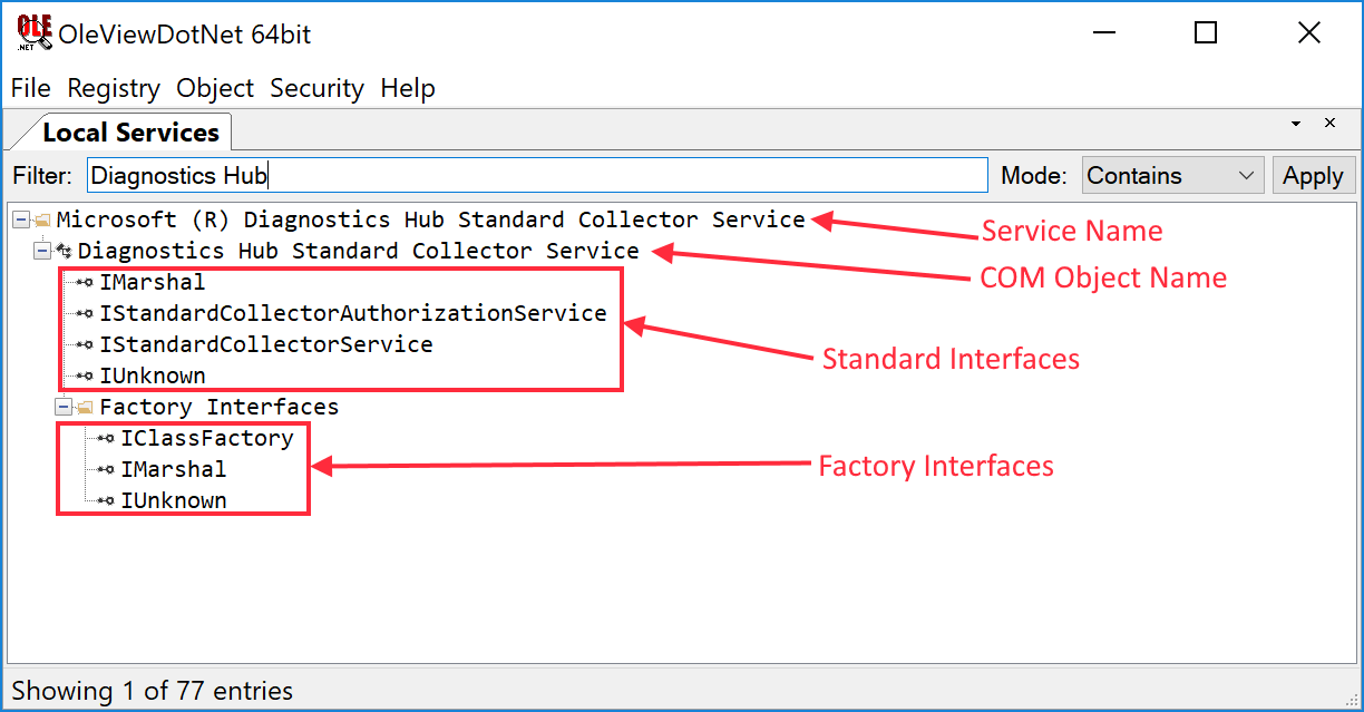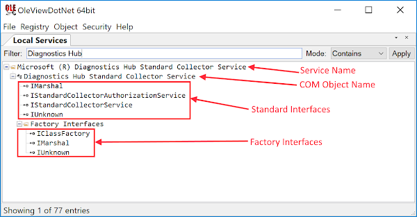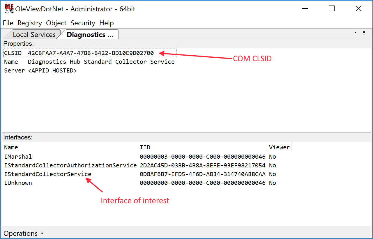 For this approach we’ll need some tools, specifically my OleViewDotNet v1.4+ (OVDN) tool from github as well as an installation of WinDBG from the SDK. The first step is to find the registration information for the DCOM object and discover what interfaces are accessible. We know that the DCOM object is hosted in a service so once you’ve loaded OVDN go to the menu Registry ⇒ Local Services and the tool will load a list of registered system services which expose COM objects. If you now find the “Microsoft (R) Diagnostics Hub Standard Collector Service” service (applying a filter here is helpful) you should find the entry in the list. If you open the service tree node you’ll see a child, “Diagnostics Hub Standard Collector Service,” which is the hosted DCOM object. If you open that tree node the tool will create the object, then query for all remotely accessible COM interfaces to give you a list of interfaces the object supports. I’ve shown this in the screenshot below:
