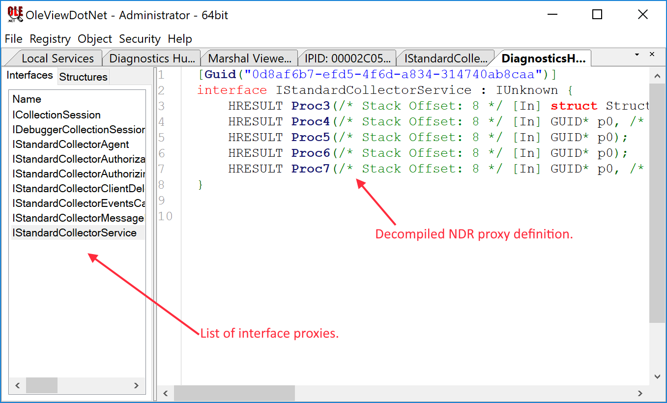 The list of methods looks correct: they start with the 3 standard methods for a COM object, which in this case are implemented by the ATL library. Following those methods are five implemented by the StandardCollectorService class. Being public symbols, this doesn’t tell us what parameters we expect to pass to the COM server. Due to C++ names containing some type information, IDA Pro might be able to extract that information for you, however that won’t necessarily tell you the format of any structures which might be passed to the function. Fortunately due to how COM proxies are implemented using the Network Data Representation (NDR) interpreter to perform marshalling, it’s possible to reverse the NDR bytecode back into a format we can understand. In this case go back to the original service information, right click the IStandardCollectorService treenode and select View Proxy Definition. This will get OVDN to parse the NDR proxy information and display a new view as shown below.