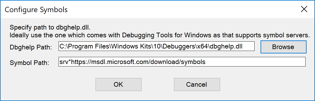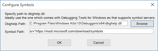 Now we’ll use a feature of OVDN which allows us to reach into the memory of the server process and find the IPID information. You can access information about all processes through the main menu Object ⇒ Processes but as we know which process we’re interested in just click the View button next to the Process ID in the marshal view. You do need to be running OVDN as an administrator otherwise you’ll not be able to open the service process. If you’ve not done so already the tool will ask you to configure symbol support as OVDN needs public symbols to find the correct locations in the COM DLLs to parse. You’ll want to use the version of DBGHELP.DLL which comes with WinDBG as that supports remote symbol servers. Configure the symbols similar to the following dialog: