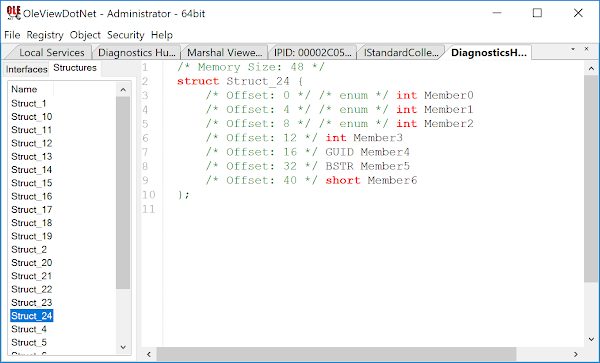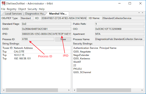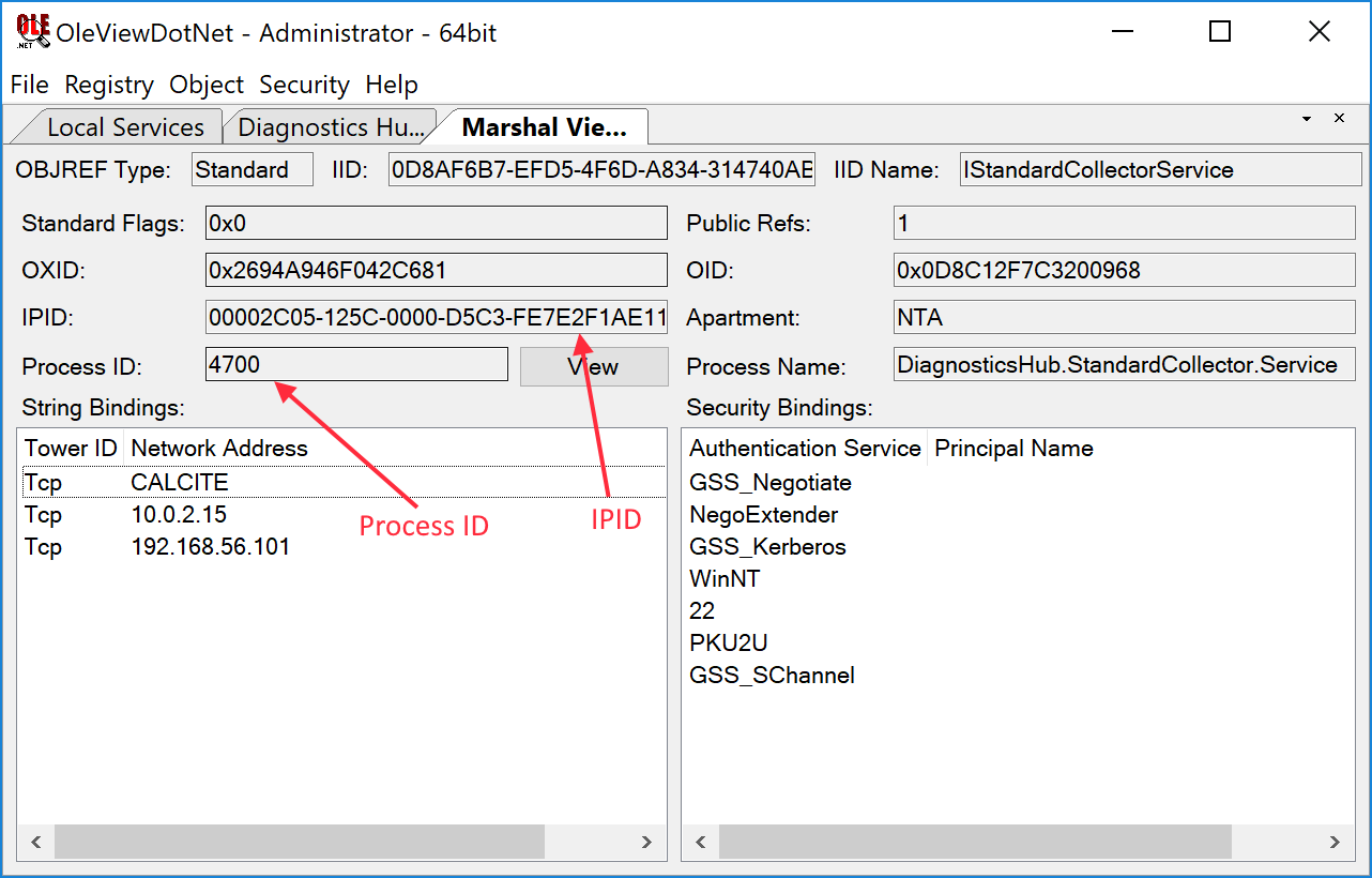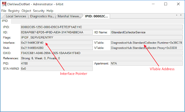 There’s a lot of information in this view but the two pieces of most interest are the Process ID of the hosting service and the Interface Pointer Identifier (IPID). In this case the Process ID should be obvious as the service is running in its own process, but this isn’t always the case—sometimes when you create a COM object you’ve no idea which process is actually hosting the COM server so this information is invaluable. The IPID is the unique identifier in the hosting process for the server end of the DCOM object; we can use the Process ID and the IPID in combination to find this server and from that find out the location of the actual VTable implementing the COM methods. It’s worth noting that the maximum Process ID size from the IPID is 16 bits; however, modern versions of Windows can have much larger PIDs so there’s a chance that you’ll have to find the process manually or restart the service multiple times until you get a suitable PID.