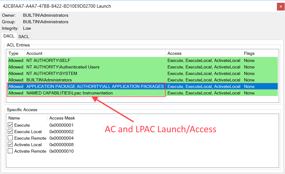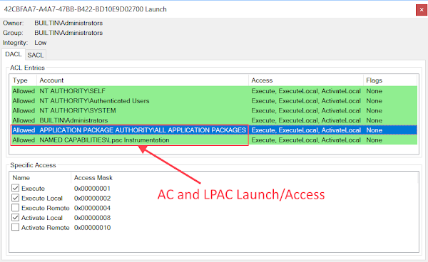 While we’re here it’s useful to inspect what security is required to access the DCOM object. If you right click the class treenode you can select View Access Permissions or View Launch Permissions and you’ll get a window that shows the permissions. In this case it shows that this DCOM object will be accessible from IE Protected Mode as well as Edge’s AppContainer sandbox, including LPAC.