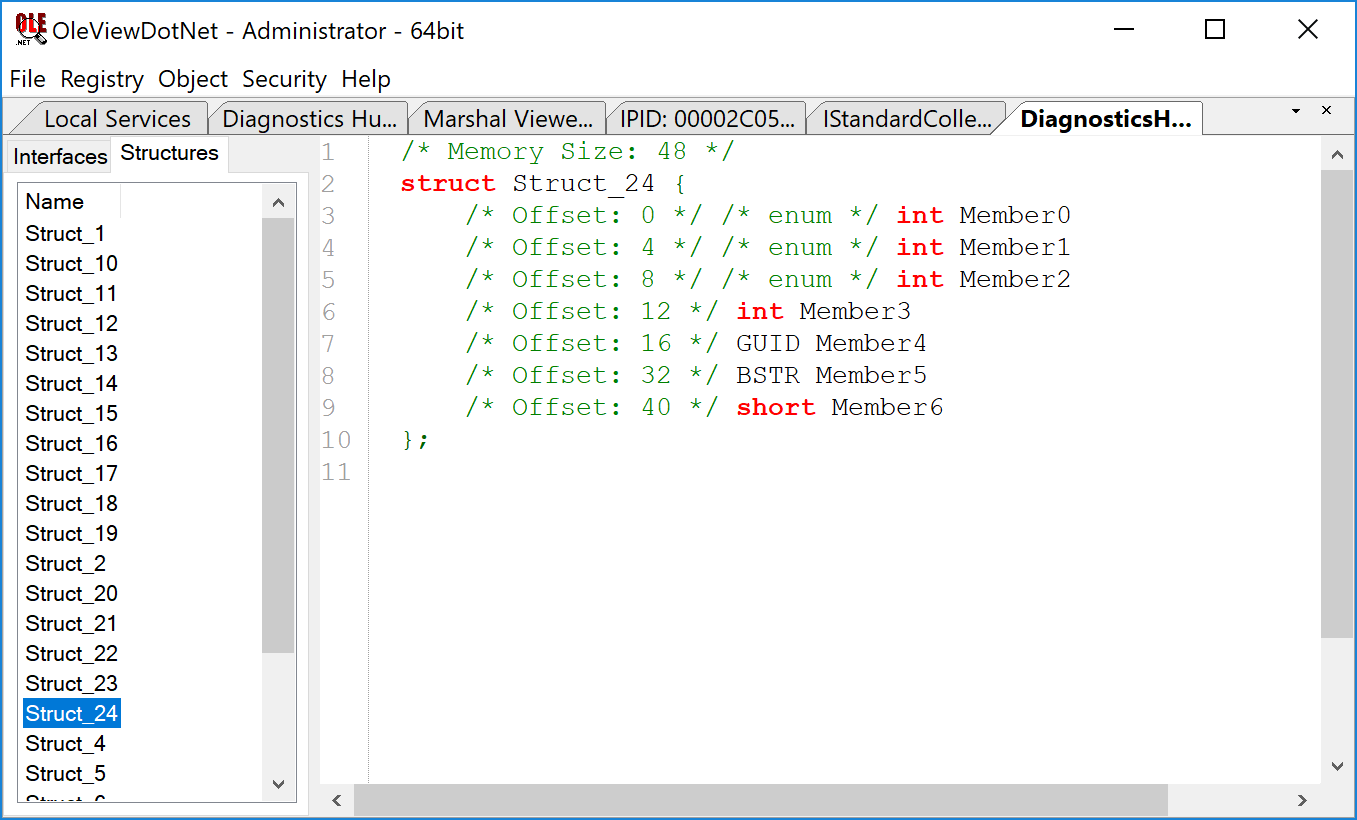 There’s one last piece missing; we don’t know the definition of the Struct_24 structure. It’s possible to extract this from the RE process but fortunately in this case we don’t have to. The NDR bytecode must know how to marshal this structure across so OVDN just extracts the structure definition out for us automatically: select the Structures tab and find Struct_24.