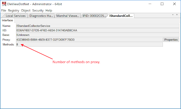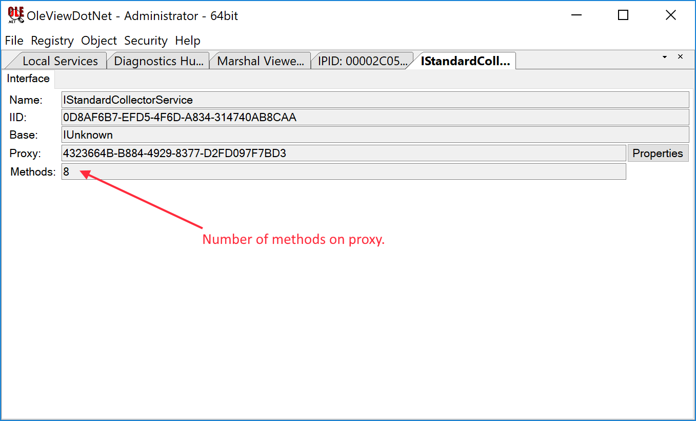 The instance gives you basic information such as the CLSID for the object which we’ll need later (in this case {42CBFAA7-A4A7-47BB-B422-BD10E9D02700}) as well as the list of supported interfaces. Now we need to ensure we have a connection to the interface we’re interested in. For that select the IStandardCollectorService interface in the lower list, then in the Operations menu at the bottom select Marshal ⇒ View Properties. If successful you’ll now see the following new view: