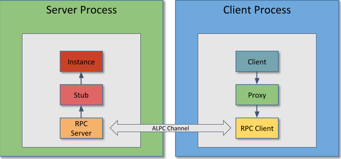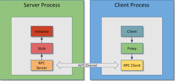 There’s not much more information that will help us here, other than we can see there are 8 methods on this interface. As with a lot of COM registration information, this value might be missing or erroneous, but in this case we’ll assume it’s correct. To understand what the methods are we’ll need to track down the implementation of IStandardCollectorService inside the COM server. This knowledge will allow us to target our RE efforts to the correct binary and the correct methods. Doing this for an in-process COM object is relatively easy as we can query for an object’s VTable pointer directly by dereferencing a few pointers. However, for out-of-process it’s more involved. This is because the actual in-process object you’d call is really a proxy for the remote object, as shown in the following diagram: