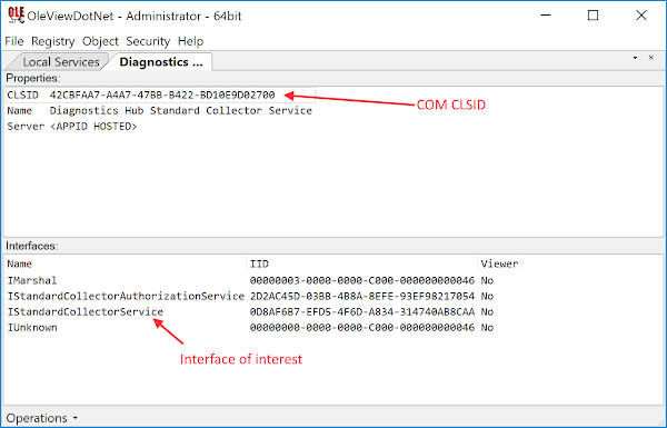 The DiagHub service was introduced in Windows 10, although there’s a service that performs a similar task called IE ETW Collector in Windows 7 and 8.1. The purpose of the service is to collect diagnostic information using Event Tracing for Windows (ETW) on behalf of sandboxed applications, specifically Edge and Internet Explorer. One of its interesting features is that it can be configured to load an arbitrary DLL from the SYSTEM32 directory, which is the exact feature that Lokihardt and I exploited to gain elevated privileges. All the functionality for the service is exposed over a registered DCOM object, so in order to load our DLL we’ll need to work out how to call methods on that DCOM object. At this point you can skip to the end but if you want to understand how I would go about finding how the DCOM object is implemented, the next section might be of interest.