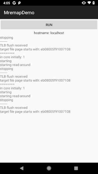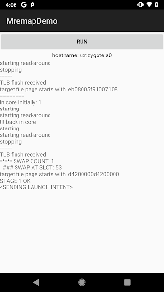 The exploit is packaged in an app that, when you press the "run" button, first uses the code in eviction.c to flush the victim page in /system/lib64/libandroid_runtime.so from the page cache; afterwards, the code in sched_test.c is used to trigger the mremap bug and overwrite the victim page. If sched_test.c reports that it has successfully located and overwritten the targeted code page, the Java code launches the isolated app TriggerService to trigger execution of com_android_internal_os_Zygote_nativeForkAndSpecialize(); otherwise, the attack is restarted.