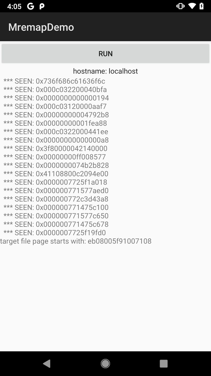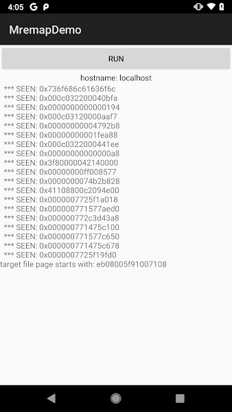 To demonstrate that the code injection into the zygote is working, the injected code reads its own SELinux context and then overwrites the hostname with that string (using sethostname()).